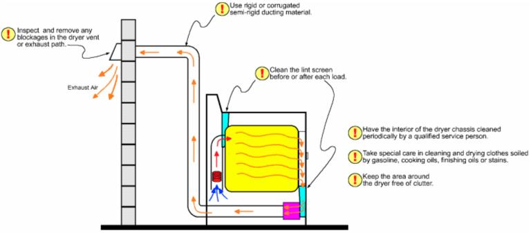 Clean behind the dryer, where lint can build up. Have a qualified service person clean the interior of the dryer chassis periodically to minimize the amount of lint accumulation. Keep the area around the dryer clean and free of clutter.